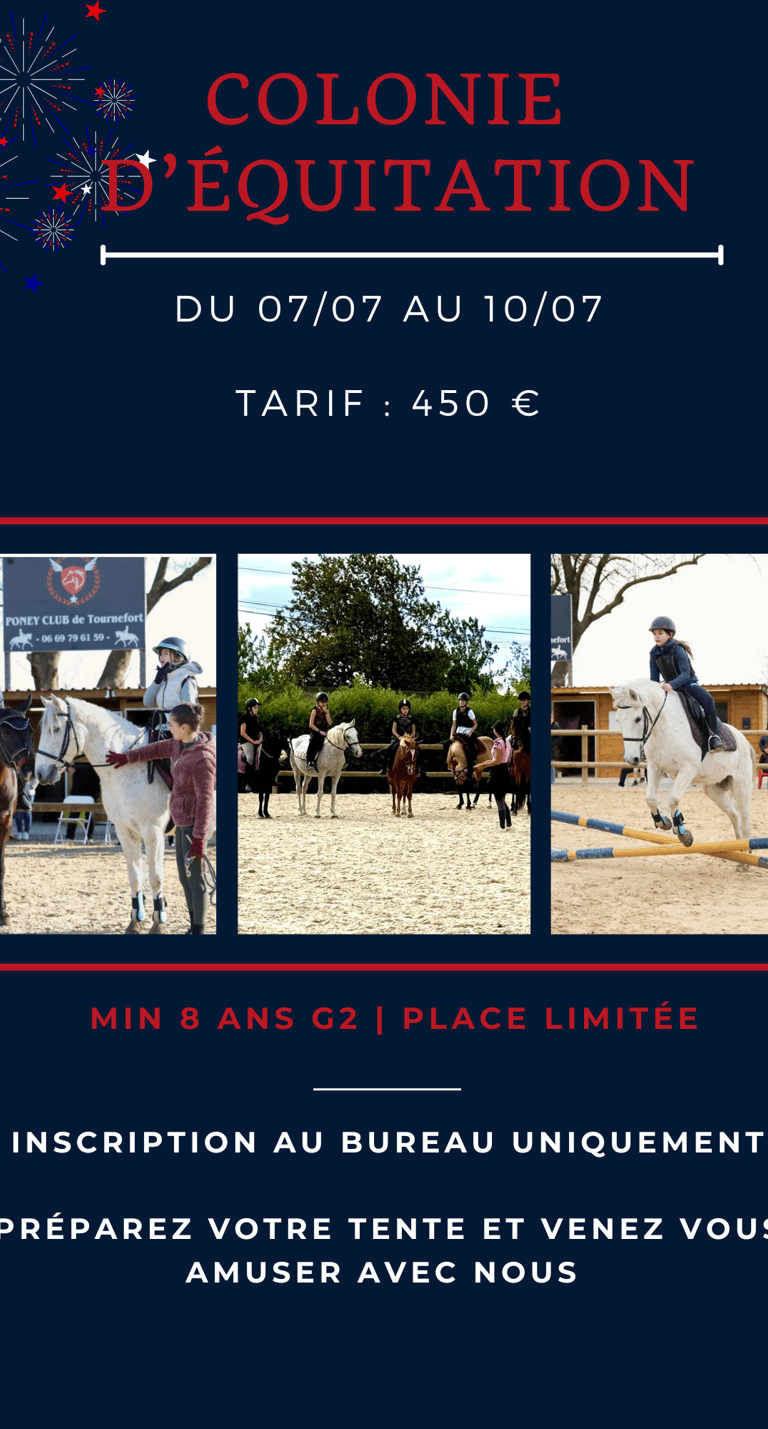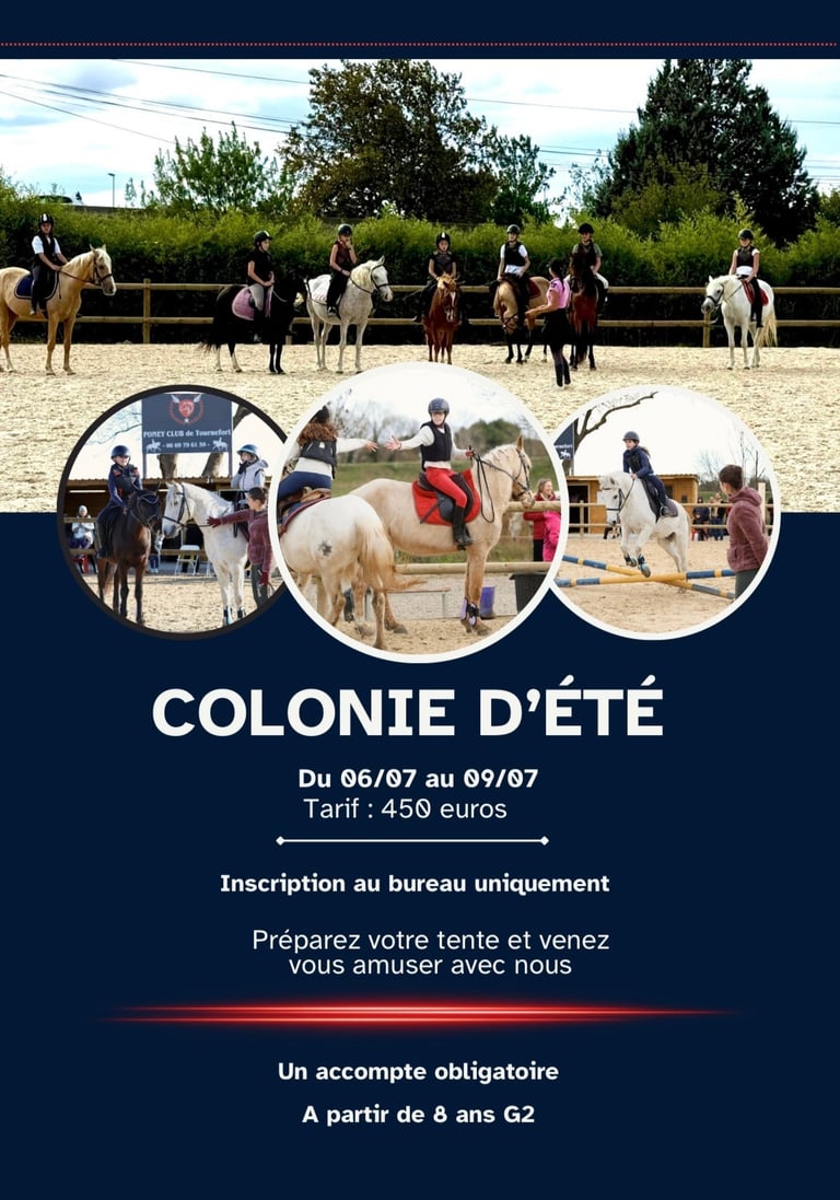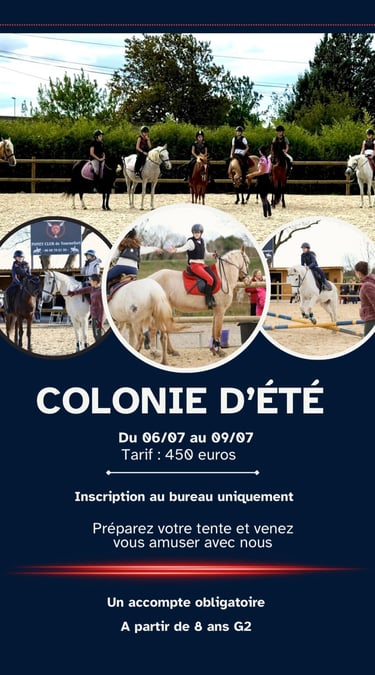 Venez découvrir nos colonies d'été d'équitation pendant les vacances ! Nous proposons une multitude d'activités pour tous les niveaux et tous les âges, que vous soyez débutant ou cavalier confirmé. Profitez de nos colonies thématiques qui incluent des sessions d'initiation, des randonnées à cheval sur la plage, ainsi que des entraînements pour le passage des galops fédéraux. Nos encadrants passionnés et expérimentés sont là pour vous accompagner et vous faire vivre des moments inoubliables en plein air. Plongez dans l’univers équestre et développez vos compétences tout en créant des souvenirs exceptionnels avec d'autres passionnés !
