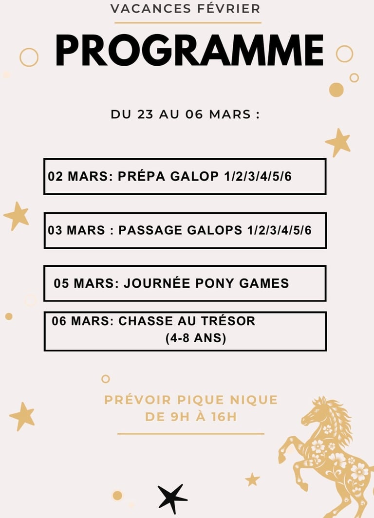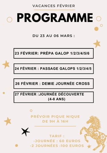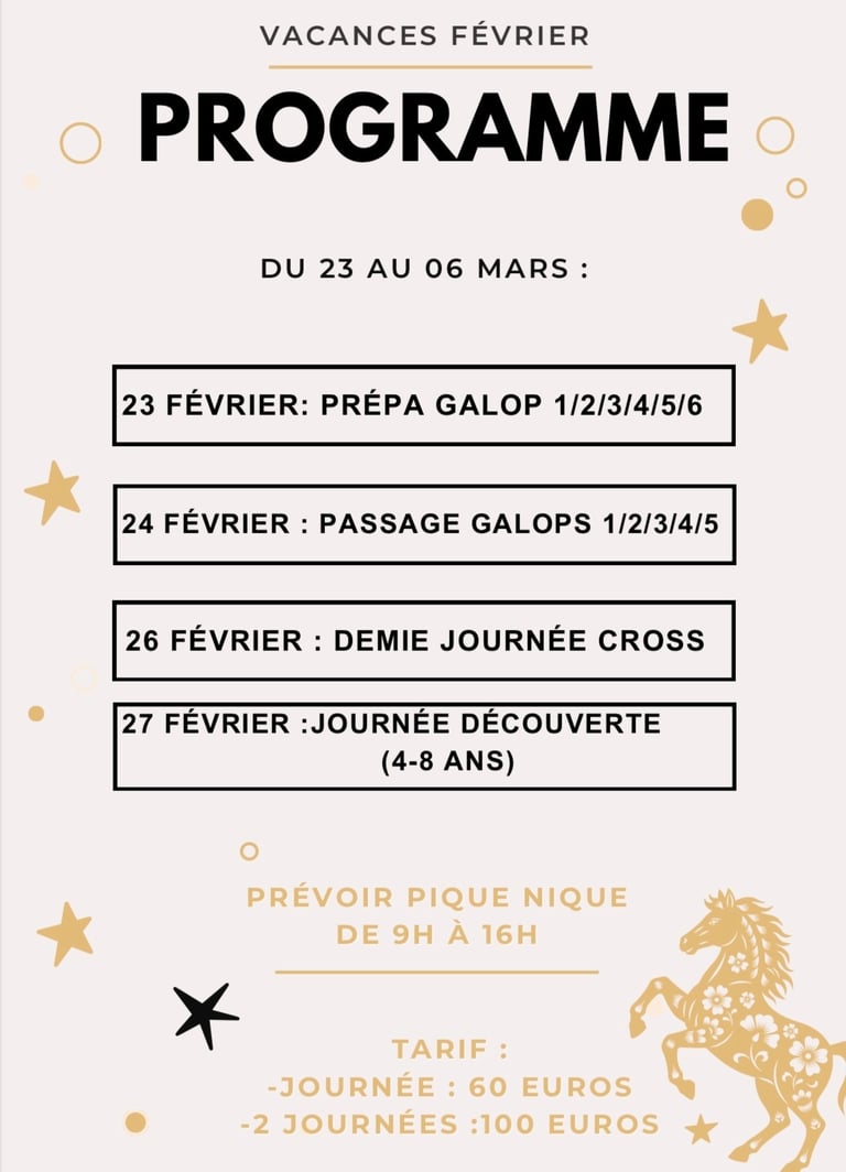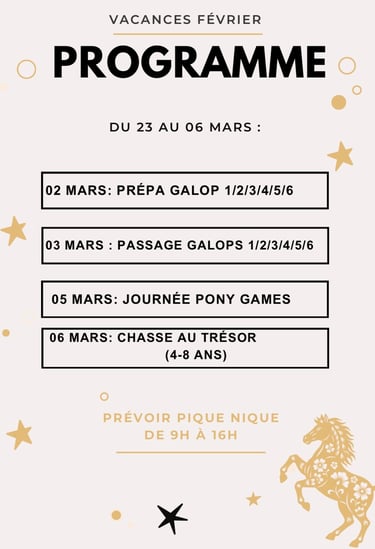 Venez découvrir nos divers stages d'équitation pendant les vacances. Nous proposons une multitude d'activité pour tous les niveaux et tous les âges. (Stages découvertes, passage de galops fédéraux, cross, balade à la plage).